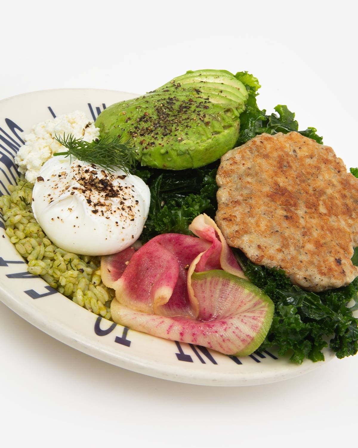 Pesto rice bowl with koji marinated chicken thigh, kale, and avocado