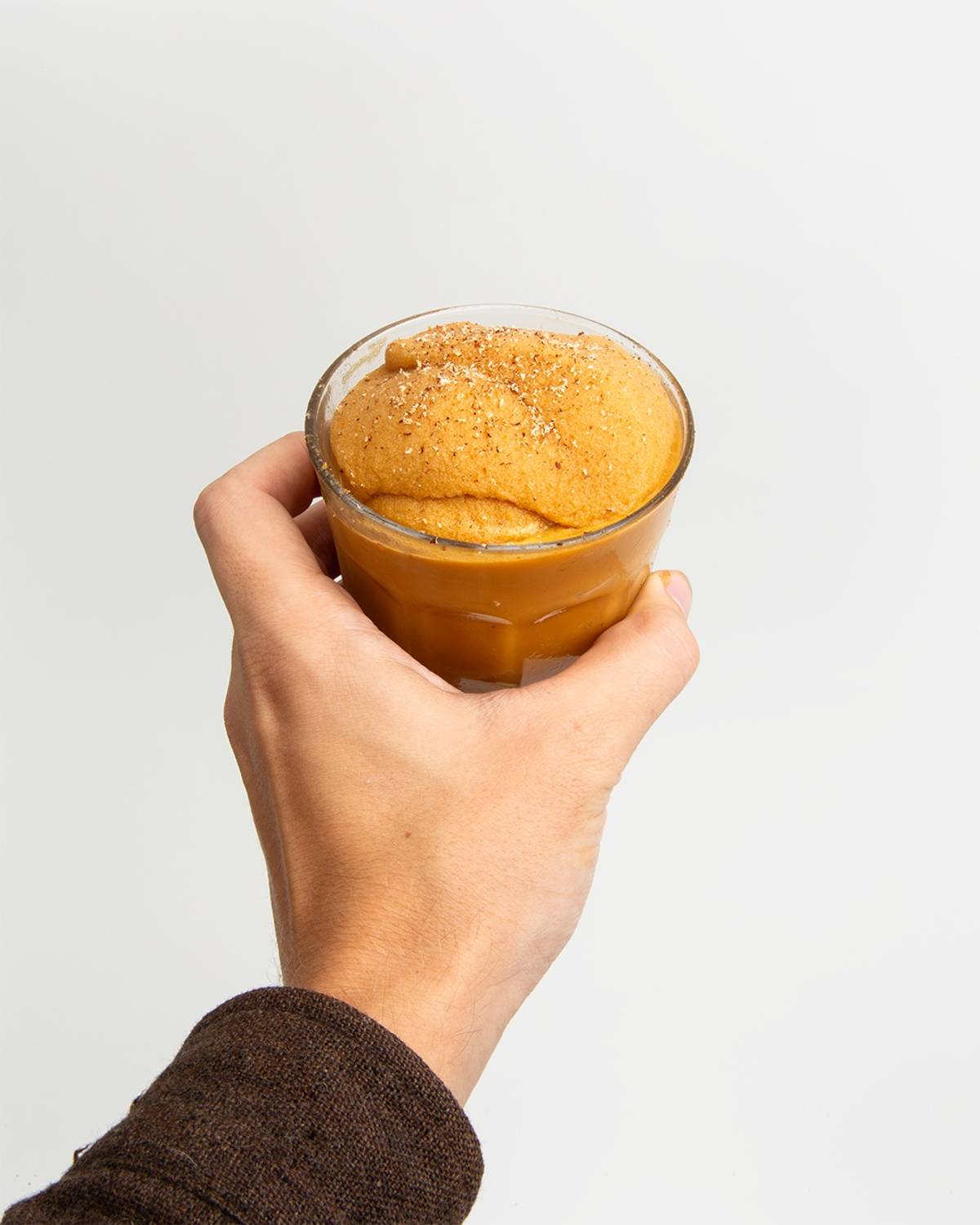 Vegan Eggnog Latte made with spiced carrot syrup, evaporated coconut milk, organic oat milk, and espresso, finished with nutmeg.