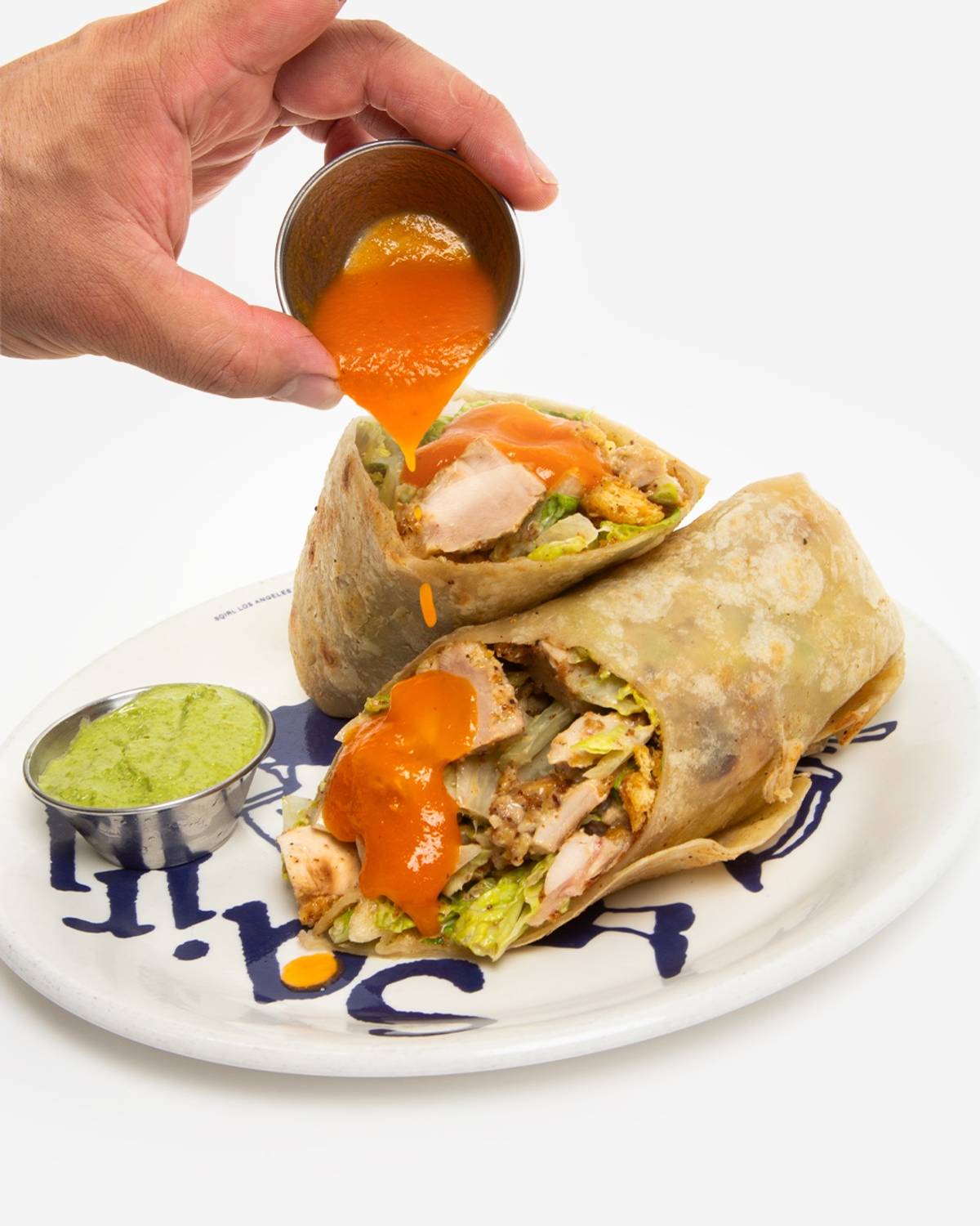 Parmesan crisps, croixtons, koji marinated chicken thigh, Little Gem and Frisée greens, all wrapped up in a perfect tortilla.