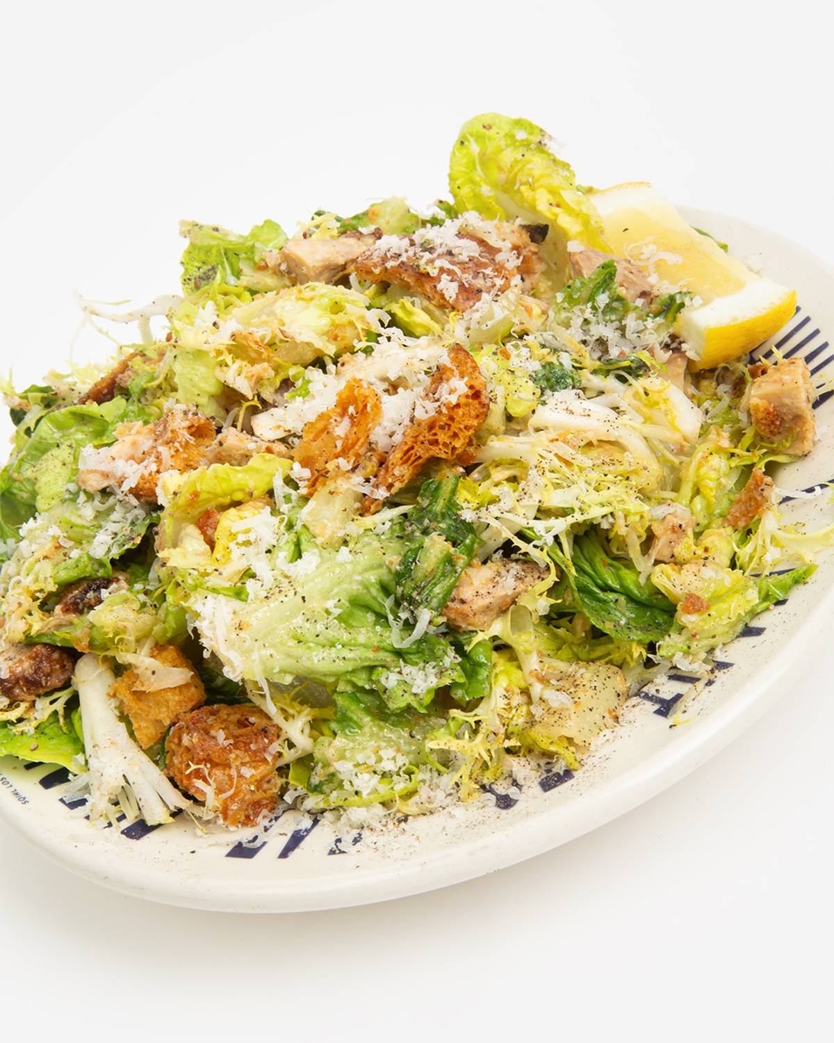 Little Gem and Frisée Caesar salad with Koji Marinated Chicken Thigh, Parmigiano Reggiano and Croissant Croutons