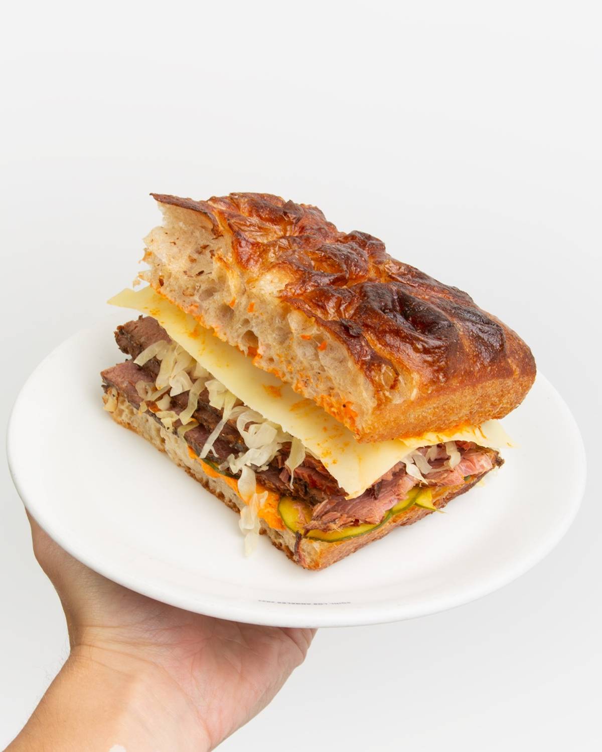 Delicious RC Provisions Pastrami sandwich with Cashew Pimento Russian dressing, B&B Pickles, and sauerkraut.