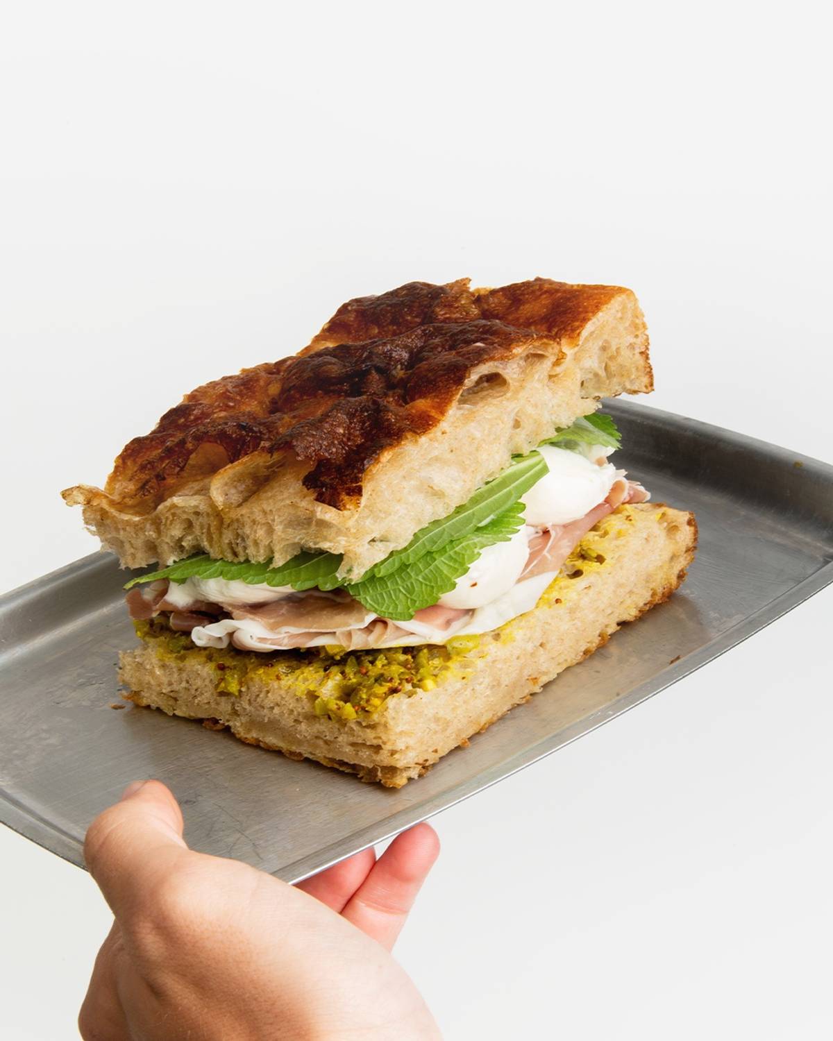 Fluffy Focaccia Sando with salty prosciutto, Burrata and Shiso
