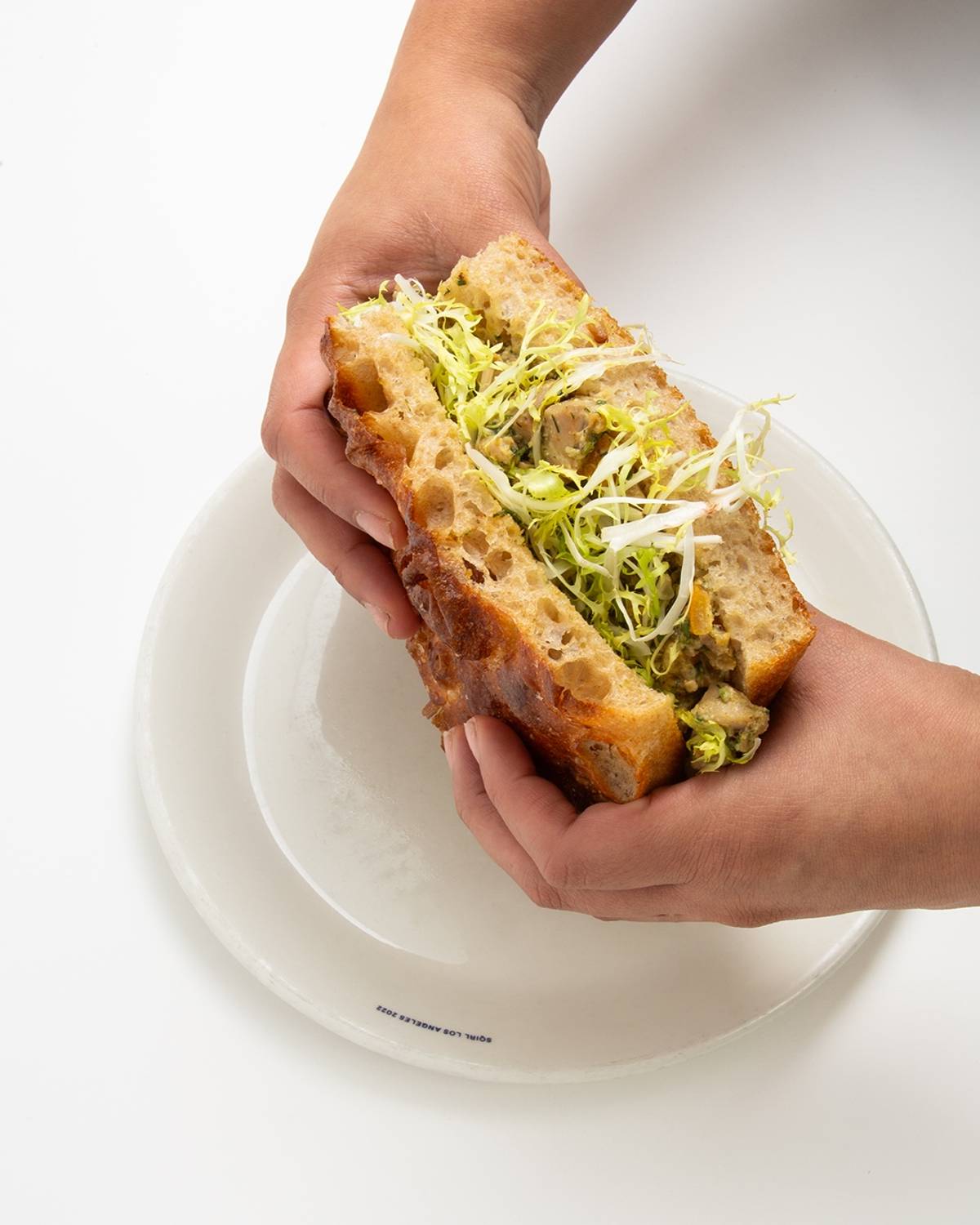 Fluffy Focaccia Sando with our housemade Koji Chicken Thigh, Tahini, Little Gem, and Comte cheese!