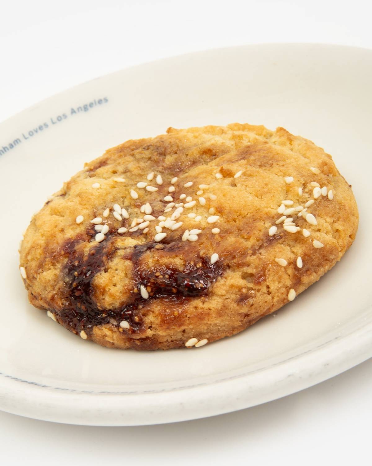 A tahini and jam swirled cookie topped with (more) jam and some sesame seeds to boot